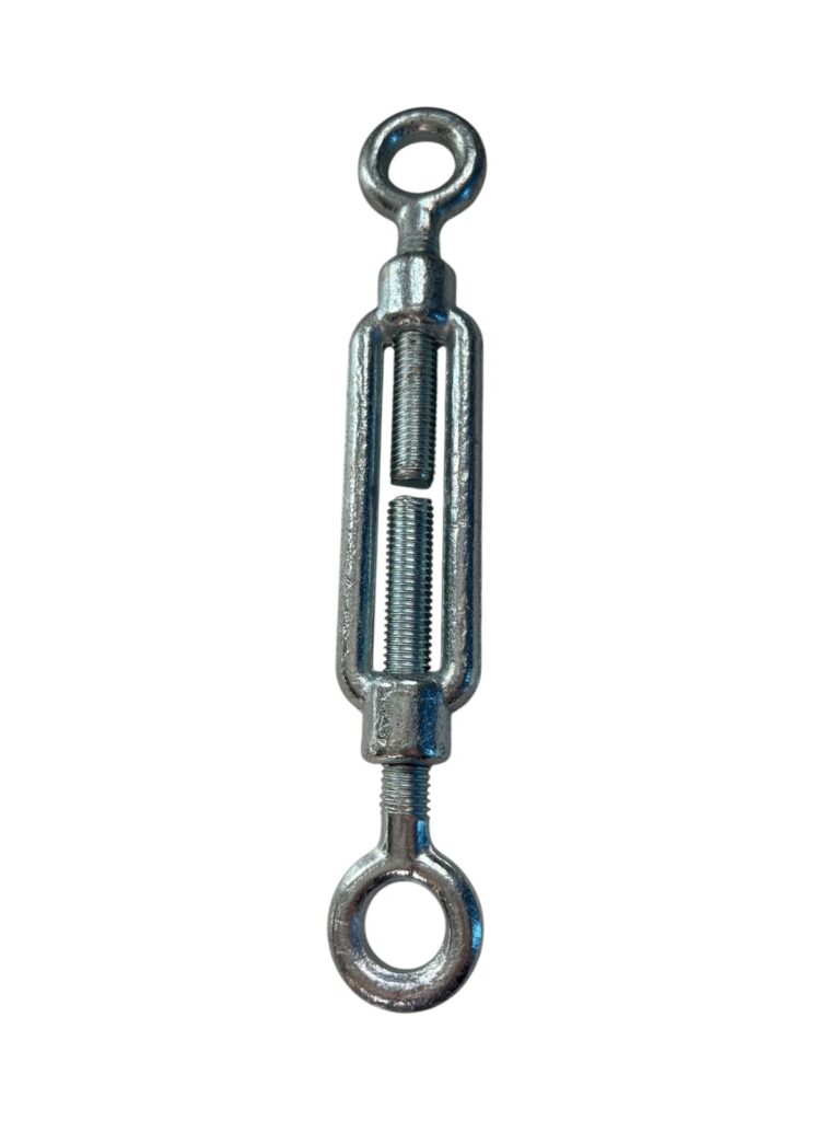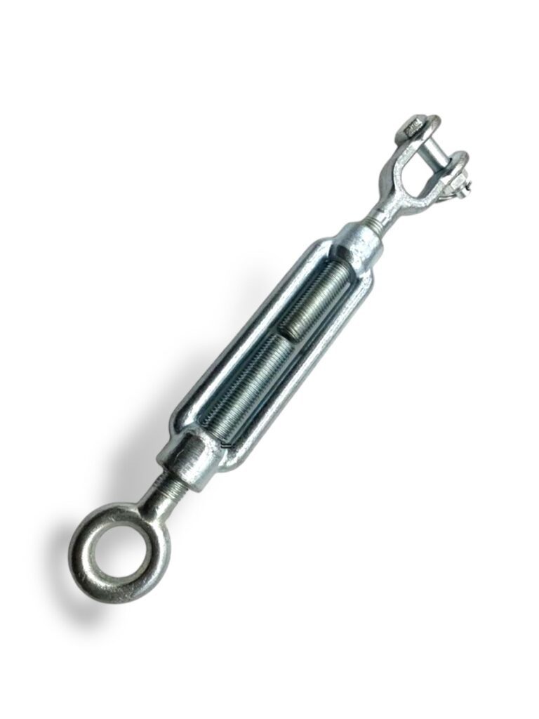 Esticador para cabos de aço e cordoalhas, tipo comercial GXO. Corpo e terminais fundidos em aço maleável – Acabamento galvanizado.