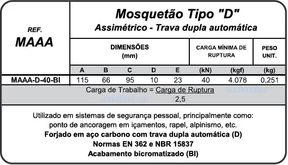 Mosquetão Tipo D – Assimétrico – Trava Dupla Automática – MAAA