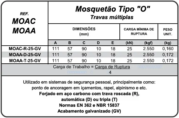 Utilizado em sistemas de segurança pessoal, principalmente como: ponto de ancoragem em içaentos, rapel, alpinismo e etc.
